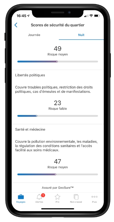 Les voyageurs peuvent accéder aux notes de sécurité hyper-locales à tout moment dans leur itinéraire TripIt pour plus de 65 000 villes et quartiers, de jour comme de nuit. Cela permet aux utilisateurs de visualiser et de mieux comprendre les conditions de sécurité actuelles par endroit.